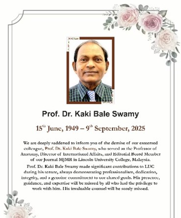 IT is with profound sadness that we mourn the passing away of Prof. Dr. Kaki Bale Swamy, Director of International Affairs, Lincoln University College (LUC), Malaysia, on September 9, 2025.